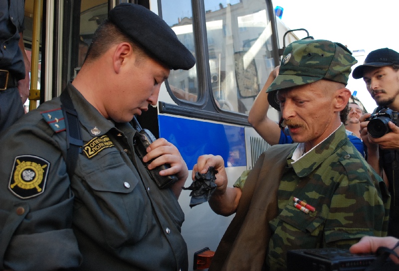 Некоторые пришедшие сами "просились" в отделение милиции. Мужчина в военной форме постучался в автозак, заставил дежурившего омоновца открыть дверь, а затем предъявил черный лоскут ткани и потребовал пропустить его внутрь.