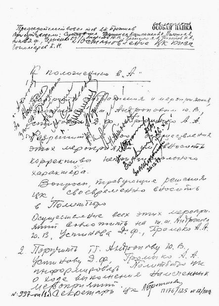 Двенадцать автографов, идущих сверху вниз и поперёк текста, принадлежат членам Политбюро, принимавшим участие в заседании 12 декабря 1979 года и так же, как завизировавший данную бумагу их главарь, несущим персональную ответственность за развязывание Советско-афганской войны. Это (в полном комплекте):